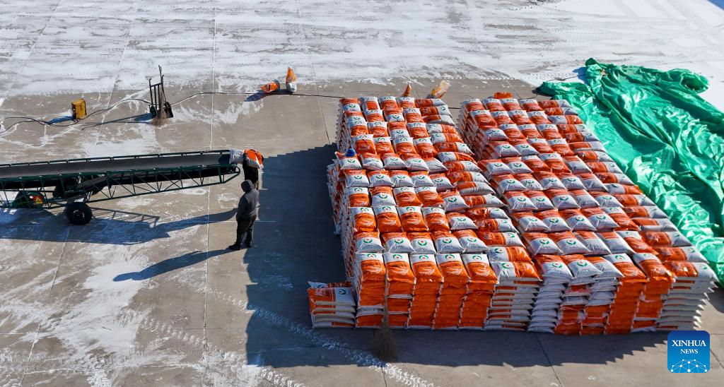Una foto aérea tomada con un dron el 28 de febrero de 2026 muestra a los empleados empaquetando semillas de arroz en la granja Youyi Farm Co., Ltd., perteneciente al grupo Beidahuang, en la ciudad de Shuangyashan, provincia de Heilongjiang, en el noreste de China. (Xinhua/Wang Song).