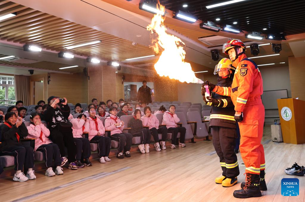 Los bomberos ayudan a los estudiantes a comprender los peligros de los materiales inflamables durante una charla en una escuela secundaria del distrito de Changning, en Shanghai, este de China, el 2 de marzo de 2026. (Xinhua/Fang Zhe).