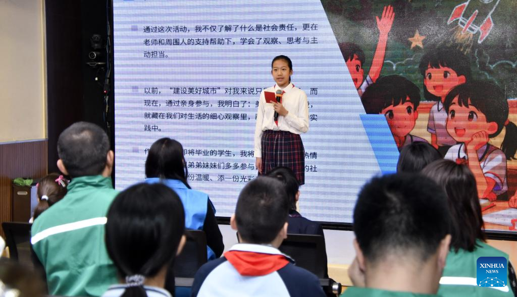 Una estudiante pronuncia un discurso durante la ceremonia de apertura del nuevo semestre en una escuela primaria del distrito de Dongcheng, en Beijing, el 2 de marzo de 2026. (Xinhua/Li Xin).