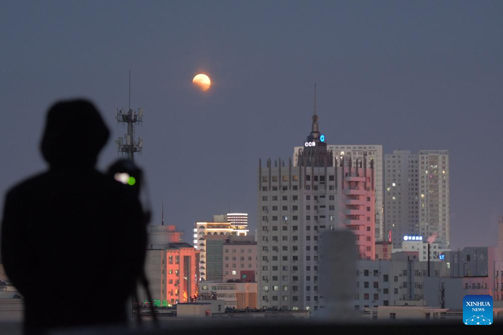 Un ciudadano fotografía un eclipse lunar total sobre la ciudad de Qiqihar, en la provincia de Heilongjiang, noreste de China, el 3 de marzo de 2026. (Foto de Wang Yonggang/Xinhua).