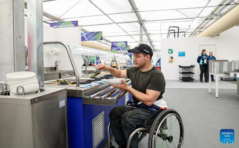 Un atleta elige comida en el comedor de la Villa Paralímpica de los Juegos Paralímpicos de Invierno de Milán-Cortina 2026 en Cortina d'Ampezzo, Italia, el 3 de marzo de 2026. (Xinhua/Wang Kaiyan).