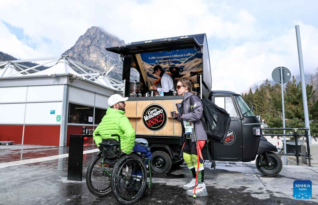 Gente charlando en un camión cafetería en la Villa Paralímpica de los Juegos Paralímpicos de Invierno de Milán-Cortina 2026 en Cortina d'Ampezzo, Italia, el 3 de marzo de 2026. (Xinhua/Wang Kaiyan).