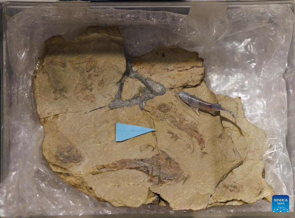 Imagen del 3 de marzo de 2026 del fósil de Eosteus chongqingensis en el Instituto de Paleontología y Paleoantropología de Vertebrados de la Academia de Ciencias de China, en Beijing, capital de China. Los fósiles de dos peces de hace más de 400 millones de años, uno era una diminuta criatura aerodinámica y el otro un gigante entre los vertebrados de su tiempo con dientes extraños, han sido descubiertos en China, llenando un vacío crucial en el proceso evolutivo "de pez a humano". (Xinhua/Jin Liwang)