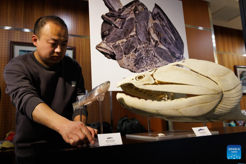 Imagen del 3 de marzo de 2026 de un trabajador colocando modelos de Eosteus chongqingensis (i) y Megamastax amblyodus restaurados en el Instituto de Paleontología y Paleoantropología de Vertebrados de la Academia de Ciencias de China, en Beijing, capital de China. Los fósiles de dos peces de hace más de 400 millones de años, uno era una diminuta criatura aerodinámica y el otro un gigante entre los vertebrados de su tiempo con dientes extraños, han sido descubiertos en China, llenando un vacío crucial en el proceso evolutivo "de pez a humano". (Xinhua/Jin Liwang)