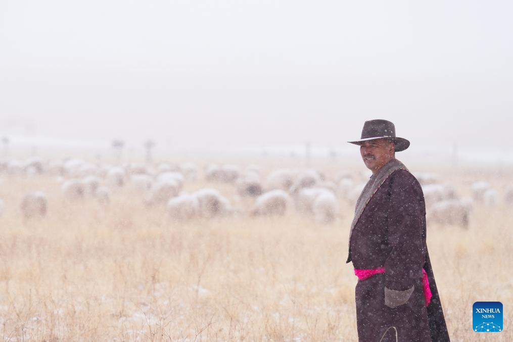 Un pastor cuida su rebaño en la nieve en el distrito de Qilian, en la prefectura autónoma de la etnia tibetana de Haibei, provincia de Qinghai, en el noroeste de China, el 8 de marzo de 2026. (Xinhua/Zhang Long).