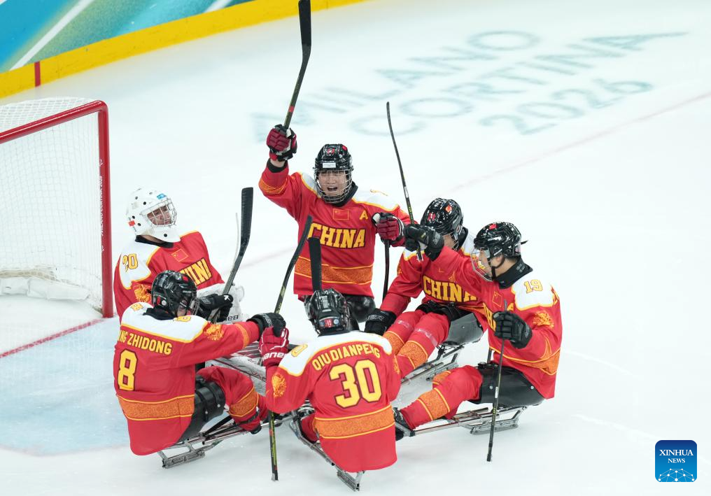 Imagen del 7 de marzo de 2026 de jugadores de China animándose durante el partido de la ronda preliminar de grupo A entre China y Alemania de para hockey sobre hielo en los Juegos Paralímpicos de Invierno Milán-Cortina 2026, en Milán, Italia. (Xinhua/Li Jing)