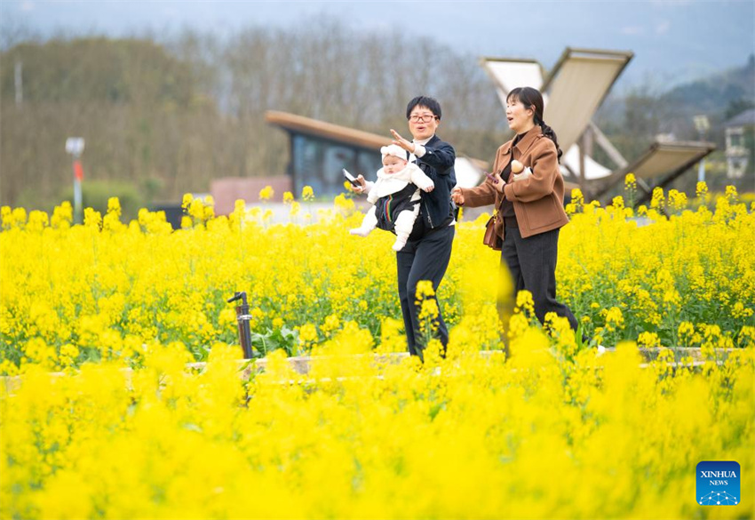 Turistas pasean y se divierten en un campo de flores de colza en la aldea de Jiangjun, ciudad de Qitang, municipalidad de Chongqing, en el suroeste de China, el 9 de marzo de 2026. (Xinhua/Tang Yi).