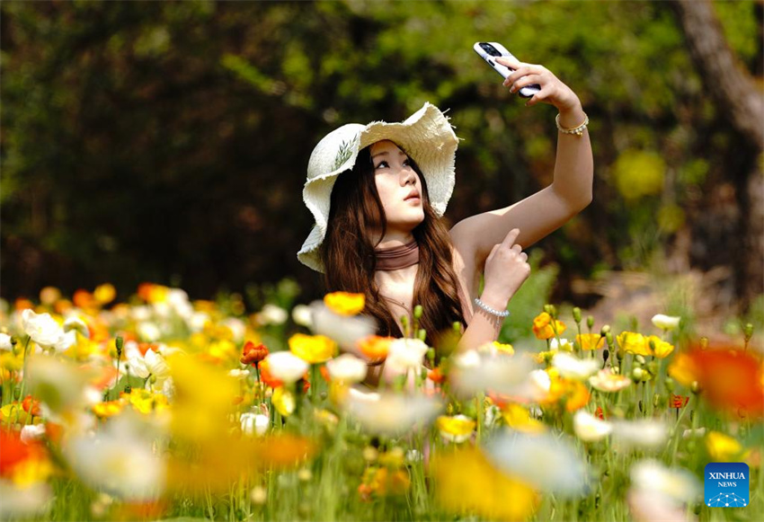 Una visitante se hace selfis con flores en una zona pintoresca de Kunming, provincia de Yunnan, suroeste de China, el 10 de marzo de 2026. (Xinhua/Chen Xinbo).