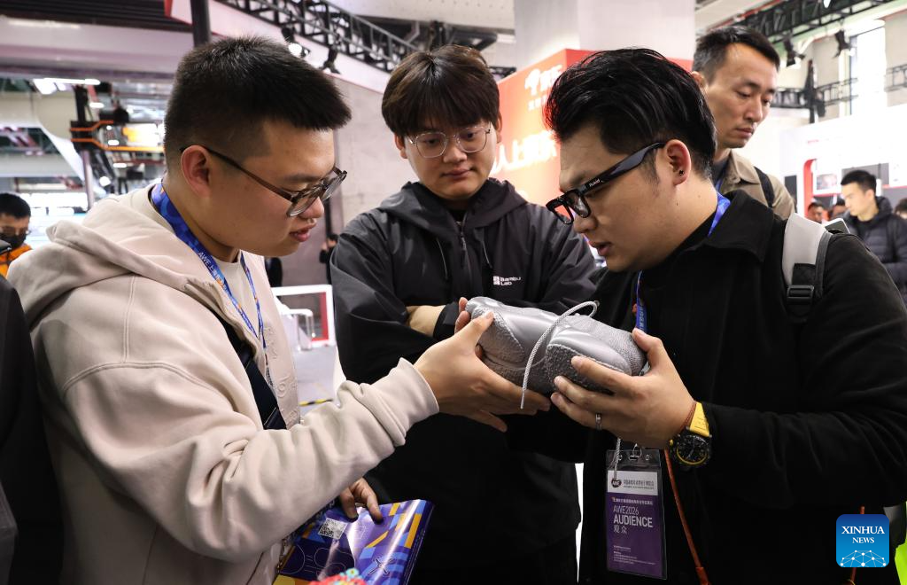 Los visitantes observan una zapatilla impresa en 3D durante la Exposición Mundial de Electrodomésticos y Electrónica 2026 en Shanghai, el 12 de marzo de 2026. (Xinhua/Fang Zhe).