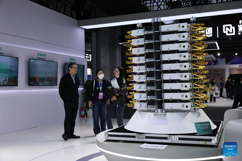 Los visitantes posan junto a una maqueta de satélites apilados durante la Exposición Mundial de Electrodomésticos y Electrónica 2026 en Shanghai, el 12 de marzo de 2026. (Xinhua/Fang Zhe).