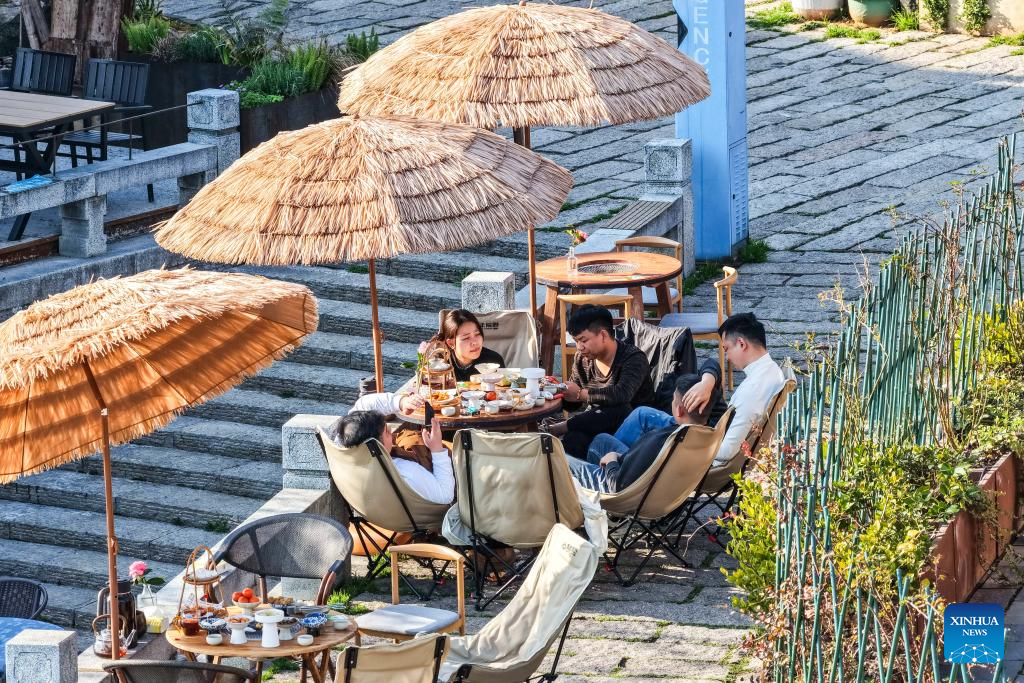 Una foto tomada con un dron muestra a personas disfrutando de su tiempo libre en Changde Hejie, a orillas del río Chuanzi, en Changde, provincia de Hunan, en el centro de China, el 11 de marzo de 2026. (Xinhua/Chen Sihan).
