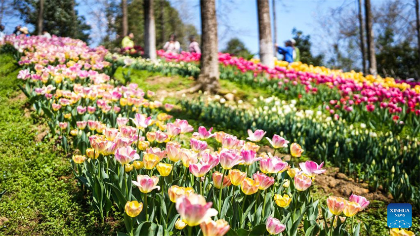 Esta foto tomada el 12 de marzo de 2026 muestra tulipanes en el Parque Forestal Nacional Longjiashan, en el distrito de Longli, provincia de Guizhou, suroeste de China. (Xinhua/Tao Liang).