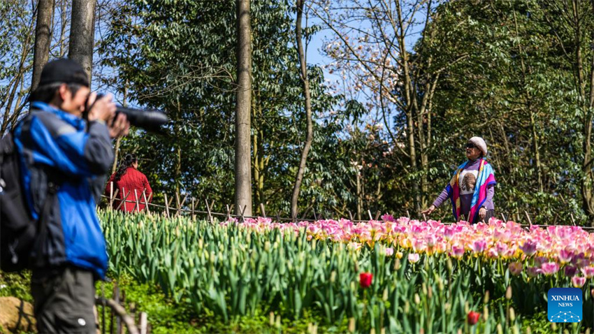 Turistas contemplan tulipanes en un parque del distrito de Longli, provincia china de Guizhou