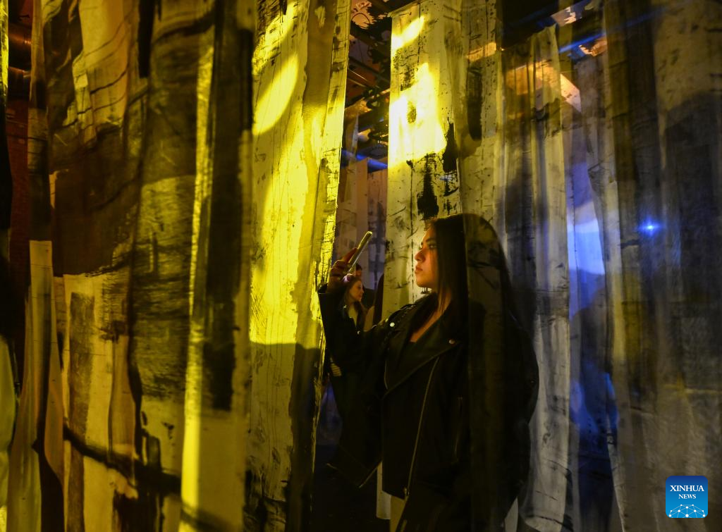 Imagen del 13 de marzo de 2026 de una mujer tomando fotografías de instalaciones lumínicas en el LuzMadrid 2026, un festival internacional de luz, en Madrid, España. LuzMadrid 2026 se celebra aquí del 12 al 14 de marzo. (Xinhua/Cheng Min)