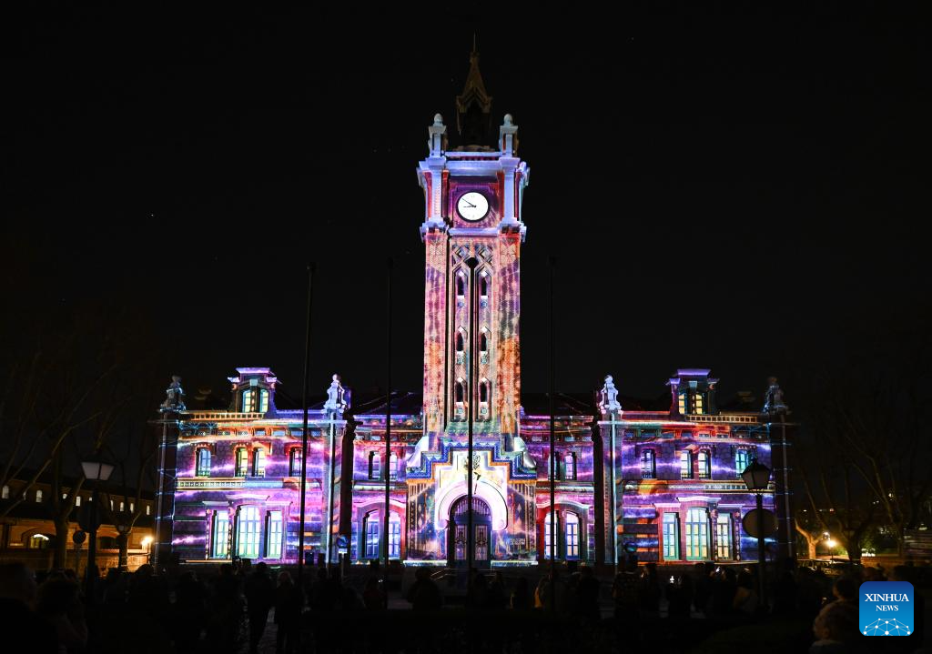 Imagen del 13 de marzo de 2026 de un espectáculo de luz proyectado sobre la fachada de un campanario en el LuzMadrid 2026, un festival internacional de luz, en Madrid, España. LuzMadrid 2026 se celebra aquí del 12 al 14 de marzo. (Xinhua/Cheng Min)