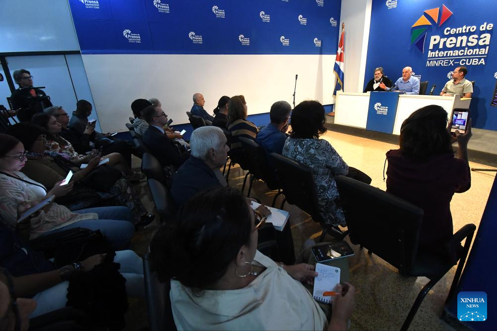 El presidente de la Unión de Periodistas de Cuba, Ricardo Ronquillo (c-atrás), y el presidente de la Casa de Las Américas, Abel Prieto (i-atrás), participan en una conferencia de prensa para anunciar la celebración de la V edición del Coloquio Internacional Patria, en La Habana, capital de Cuba, el 18 de marzo de 2026. La V edición del Coloquio Internacional Patria, que tendrá lugar del 16 al 18 de abril próximo, en La Habana, estará dedicado al centenario del natalicio del líder de la Revolución cubana, Fidel Castro (1926-2016), informaron el miércoles los organizadores. (Xinhua/Joaquín Hernández)