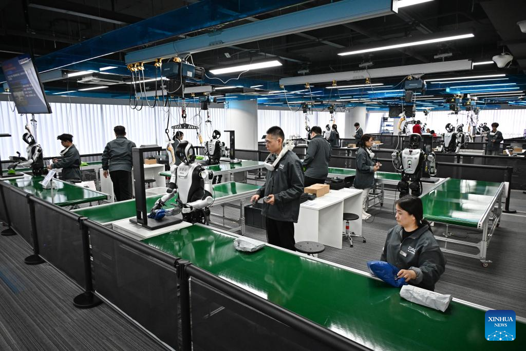 Imagen del 23 de marzo de 2026 de empleados realizando entrenamiento y recopilación de datos con robots humanoides en el Centro de Entrenamiento de Datos para Robots Humanoides de Qingdao, en el distrito de Laoshan de Qingdao, en la provincia de Shandong, en el este de China. Ubicado en el distrito de Laoshan de la ciudad, el Centro de Entrenamiento de Datos para Robots Humanoides de Qingdao está equipado con escenarios de recopilación de datos para robots humanoides, tales como la fabricación industrial inteligente, el hogar inteligente y los servicios comerciales, lo que proporciona apoyo para la investigación y el desarrollo relacionados con los robots humanoides. (Xinhua/Li Ziheng)