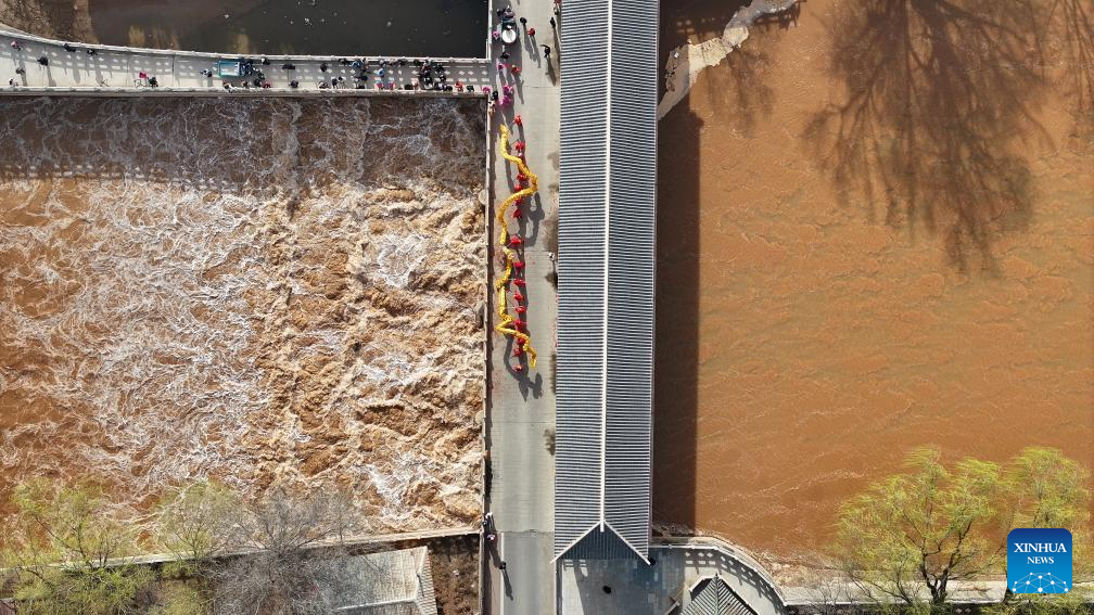 Vista aérea tomada con un dron el 24 de marzo de 2026 de una compuerta de esclusa abierta que desvía agua del río Amarillo para el riego, en Qingtongxia, en la región autónoma de la etnia hui de Ningxia, en el noroeste de China. (Xinhua/Wang Peng)