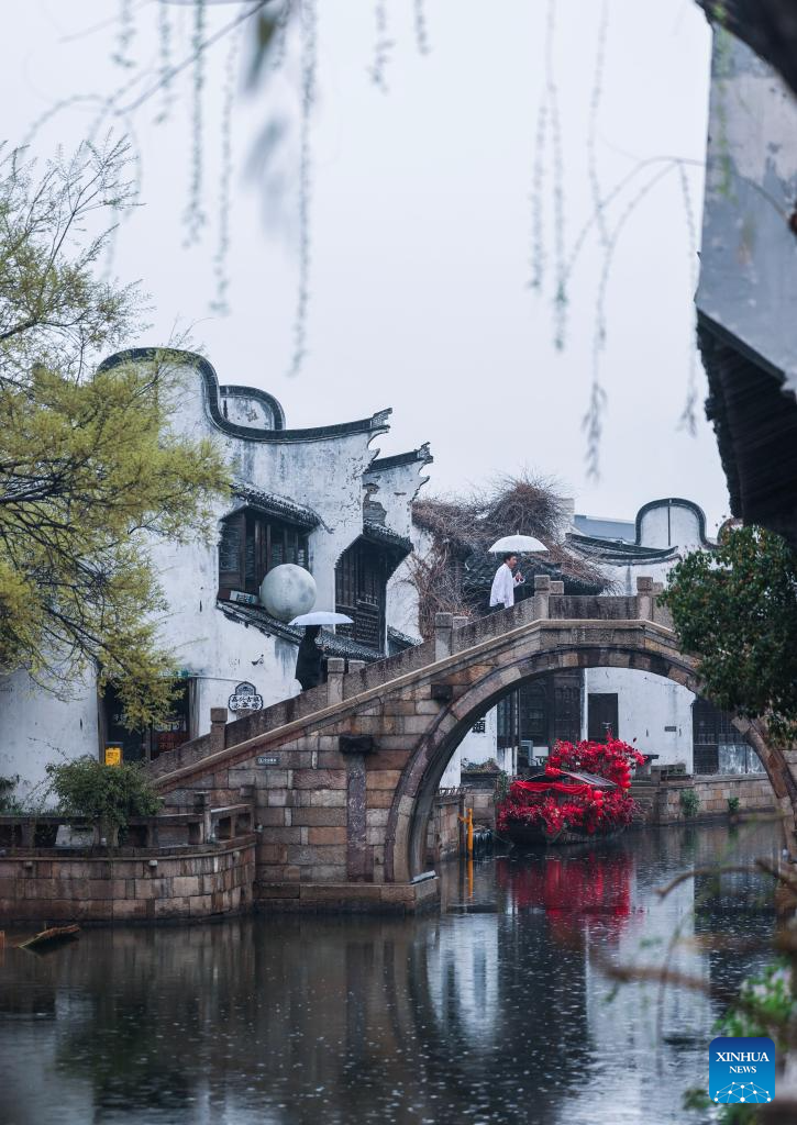 Esta fotografía, tomada el 24 de marzo de 2026, muestra el paisaje primaveral del barrio histórico y cultural de Yuehe, en el distrito de Nanhu de la ciudad de Jiaxing, provincia de Zhejiang, al este de China. (Xinhua/Xu Yu).