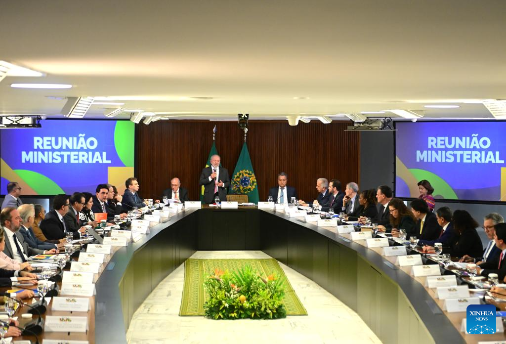 El presidente brasileño, Luiz Inácio Lula da Silva (c-atrás), habla durante una reunión ministerial en el Palacio de Planalto, en Brasilia, Brasil, el 31 de marzo de 2026. El vicepresidente de Brasil, Geraldo Alckmin, acompañará de nuevo en la fórmula oficialista como candidato a la Vicepresidencia a Lula da Silva para buscar la reelección en los comicios de octubre próximo, confirmó el martes el mandatario brasileño. (Xinhua/Lucio Tavora)