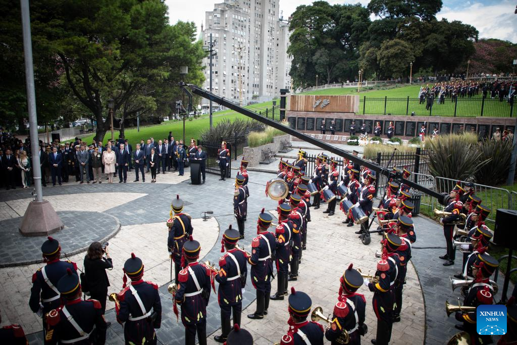 El presidente argentino, Javier Milei (c), habla durante el acto por el Día del Veterano y de los Caídos en la Guerra al cumplirse el 44° aniversario del inicio del conflicto bélico entre Argentina y Reino Unido, frente al Monumento a los Caídos en Malvinas, en la ciudad de Buenos Aires, capital de Argentina, el 2 de abril de 2026. Milei reafirmó el jueves el derecho del país sudamericano al ejercicio pleno de la soberanía sobre las Islas Malvinas, un territorio ubicado en el Atlántico sur que Reino Unido controla políticamente. (Xinhua/Martín Zabala)