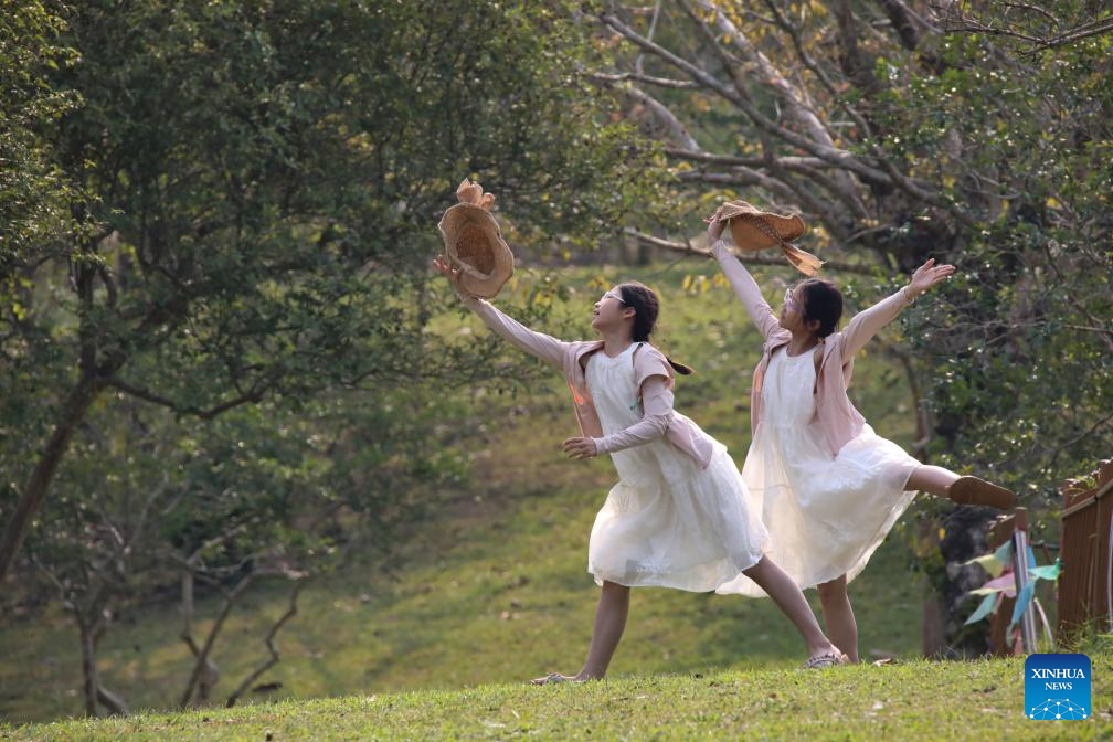 Dos estudiantes se divierten en el Jardín Botánico Tropical de Xishuangbanna de la Academia de Ciencias de China, en el distrito de Mengla, en la prefectura autónoma dai de Xishuangbanna, en la provincia de Yunnan, en el suroeste de China, el 4 de abril de 2026. Las primeras vacaciones de primavera del país para escuelas primarias y secundarias cayó justo antes del feriado de tres días del Festival Qingming, que va del sábado al lunes, en muchas localidades. Los estudiantes tuvieron la oportunidad de participar en una variedad de actividades de ocio. (Xinhua/Li Yunsheng)