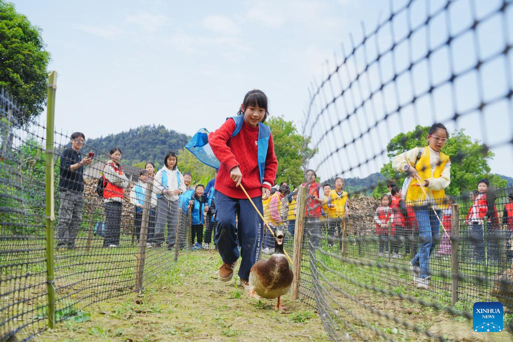 Imagen del 3 de abril de 2026 de niños participando en una competencia de persecución de patos en una granja, en la aldea de Hutou de Chongqing, en el suroeste de China. Las primeras vacaciones de primavera del país para escuelas primarias y secundarias cayó justo antes del feriado de tres días del Festival Qingming, que va del sábado al lunes, en muchas localidades. Los estudiantes tuvieron la oportunidad de participar en una variedad de actividades de ocio. (Xinhua/Qin Tingfu)