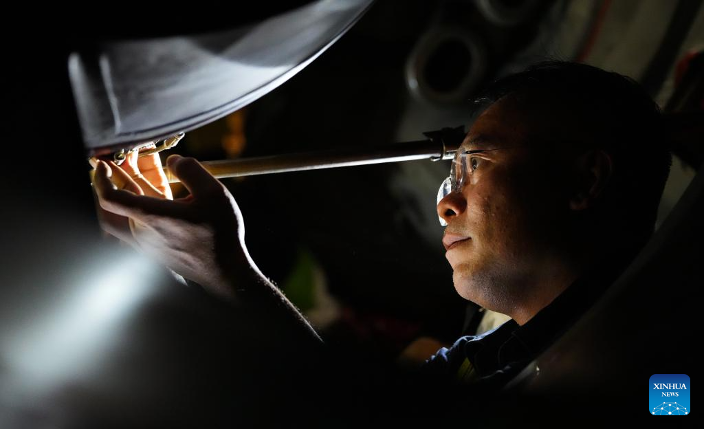 Técnicos realizan tareas de mantenimiento en un avión de China Southern Airlines decorado con motivos de la Exposición Internacional de Productos de Consumo de China (CICPE, por sus siglas en inglés) en el Aeropuerto Internacional de Haikou-Meilan, en Haikou, provincia de Hainan, al sur de China, el 4 de abril de 2026.