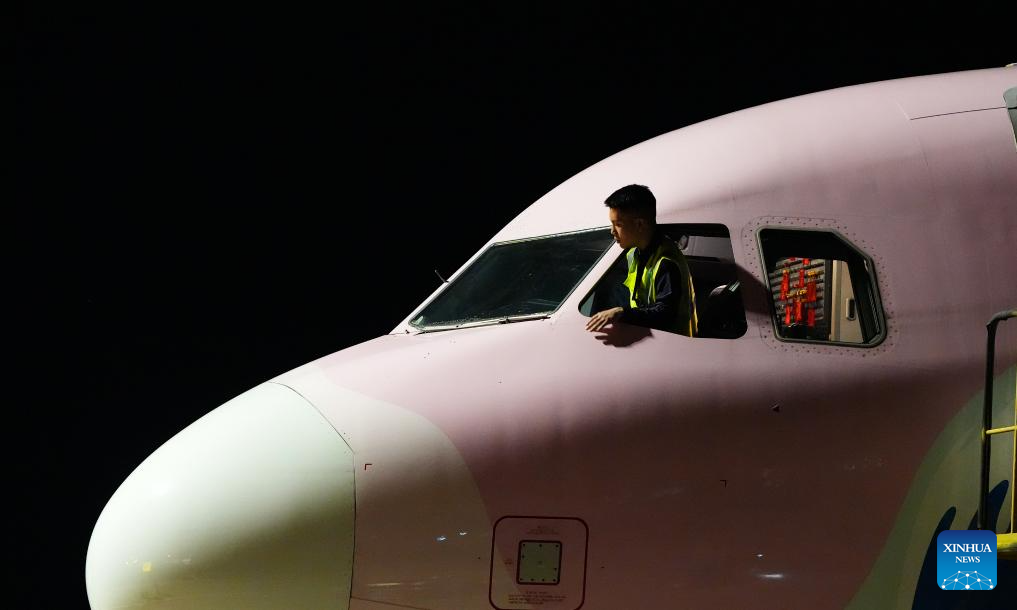 Técnicos realizan tareas de mantenimiento en un avión decorado con motivos de la Exposición Internacional de Productos de Consumo de China en Haikou
