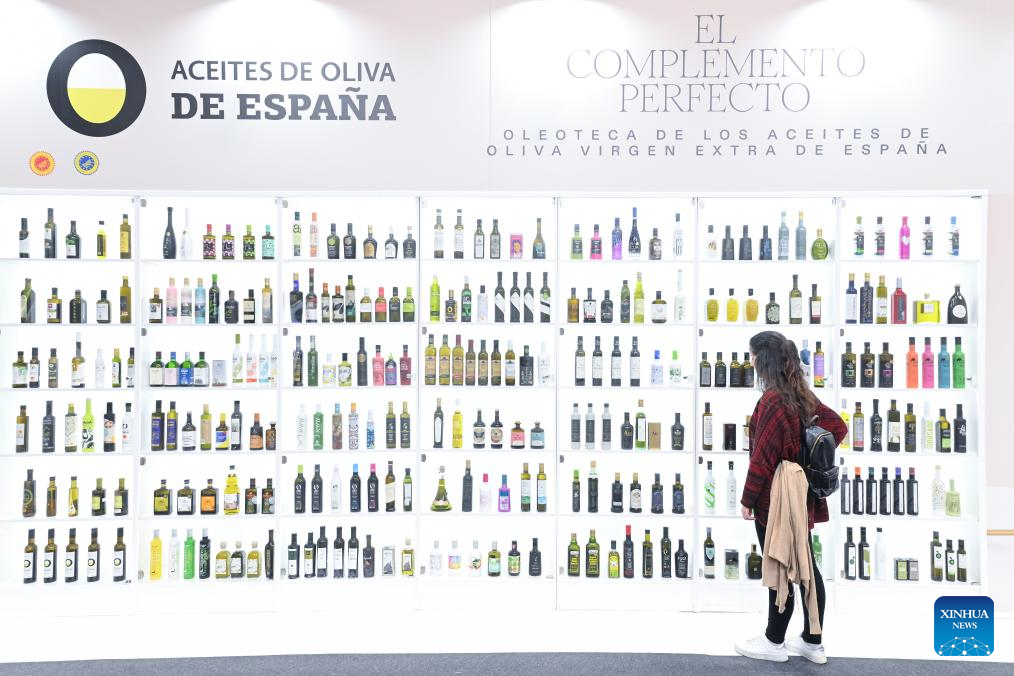 Una mujer permanece junto a un estand de aceite de oliva durante el Salón Gourmets, en Madrid, España, el 13 de abril de 2026. El 39 Salón Gourmets se celebra en Madrid del 13 al 16 de abril. (Xinhua/Gustavo Valiente)