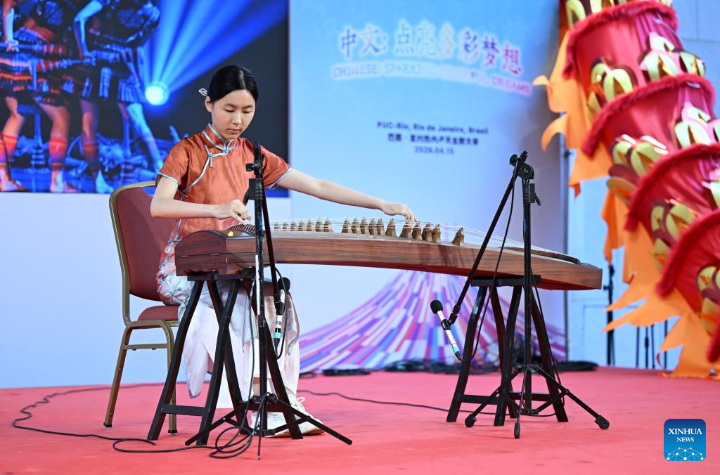 Una intérprete toca el guzheng, un instrumento musical tradicional chino, durante un acto conmemorativo del Día Internacional de la Lengua China celebrado en Río de Janeiro, Brasil, el 15 de abril de 2026. (Xinhua/Jin Haoyuan).