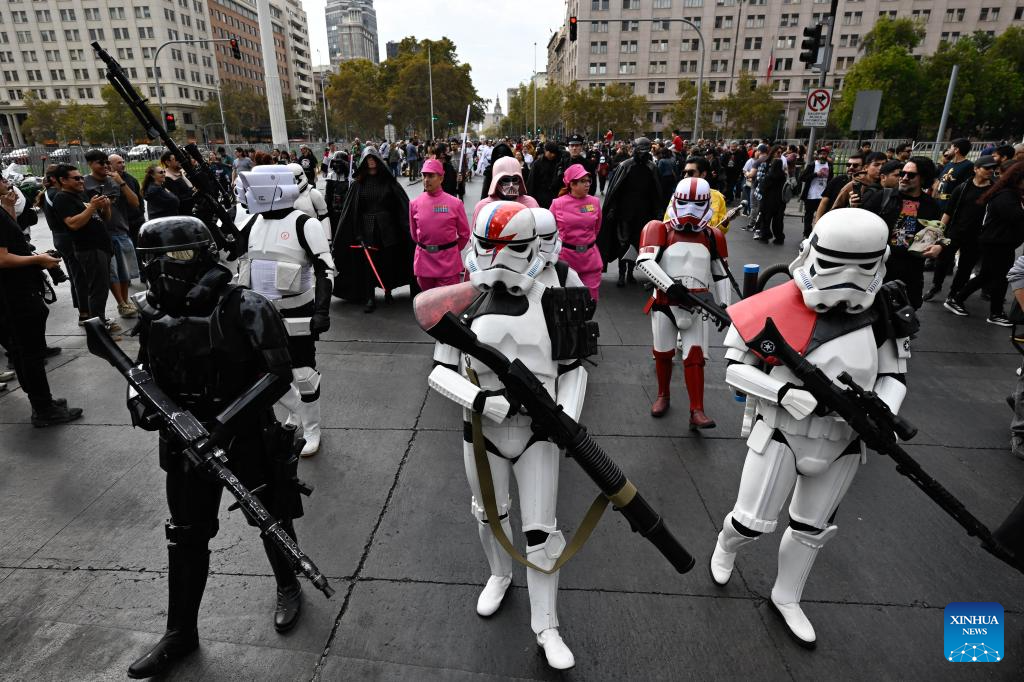 Fanáticos de la saga de Star Wars participan en el Desfile de las Galaxias 2026, en Santiago, capital de Chile, el 18 de abril de 2026. (Xinhua/Jorge Villegas)
