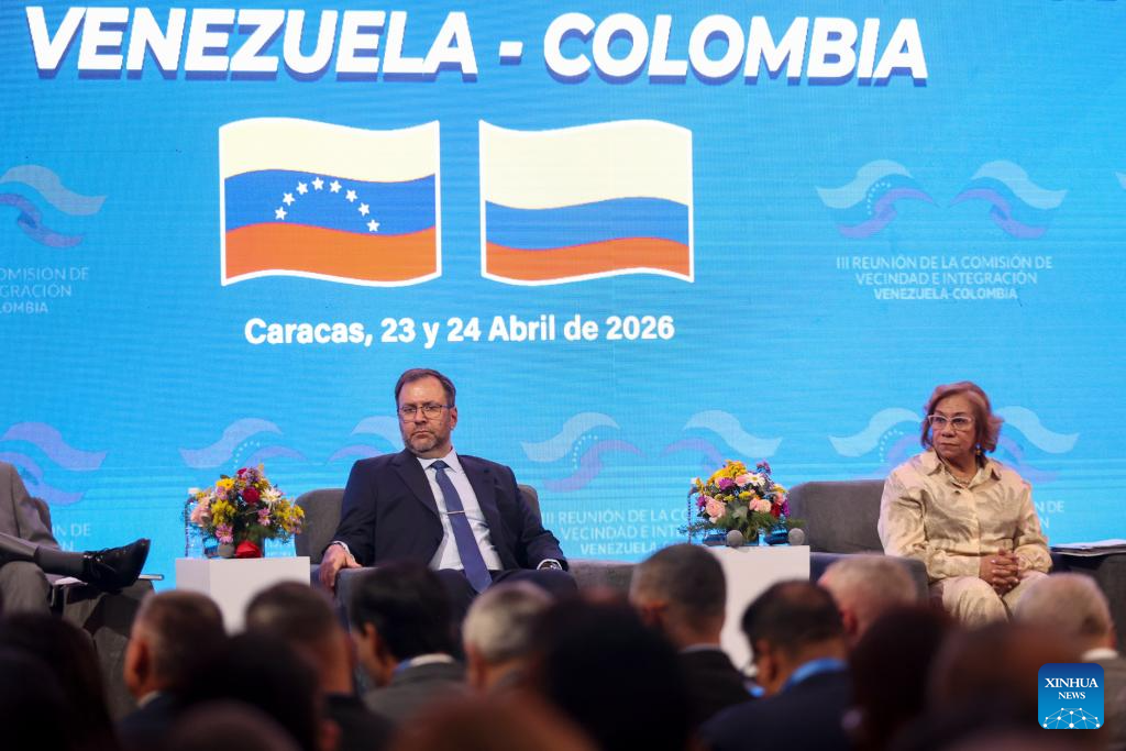El canciller de Venezuela, Yván Gil (i), y su homóloga de Colombia, Rosa Yolanda Villavicencio (d), participan en una conferencia de prensa en el marco de la III Reunión de la Comisión de Vecindad e Integración binacional, en Caracas, Venezuela, el 23 de abril de 2026. Gil y Villavicencio instalaron el jueves en Caracas la III Reunión de la Comisión de Vecindad e Integración binacional, con el fin de avanzar en iniciativas conjuntas de cooperación. (Xinhua/Str)