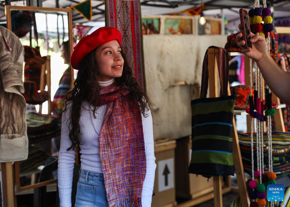 Imagen del 25 de abril de 2026 de una mujer probándose un gorro de lana en un festival de lana, en Santiago, Chile. (Xinhua/Zhou Jiayi)