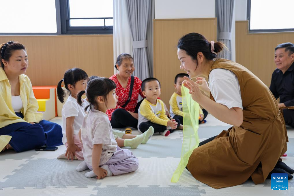 Imagen del 15 de abril de 2026 de una maestra jugando con niños en una guardería de la comunidad de Minkang del distrito de Longhua, en Shenzhen, en la provincia de Guangdong, en el sur de China. Shenzhen está creando un "círculo de guarderías de 15 minutos" que abarca los primeros 1.000 días de vida del niño para aliviar la carga de las familias y fomentar el aumento de la natalidad. (Xinhua/Liang Xu)