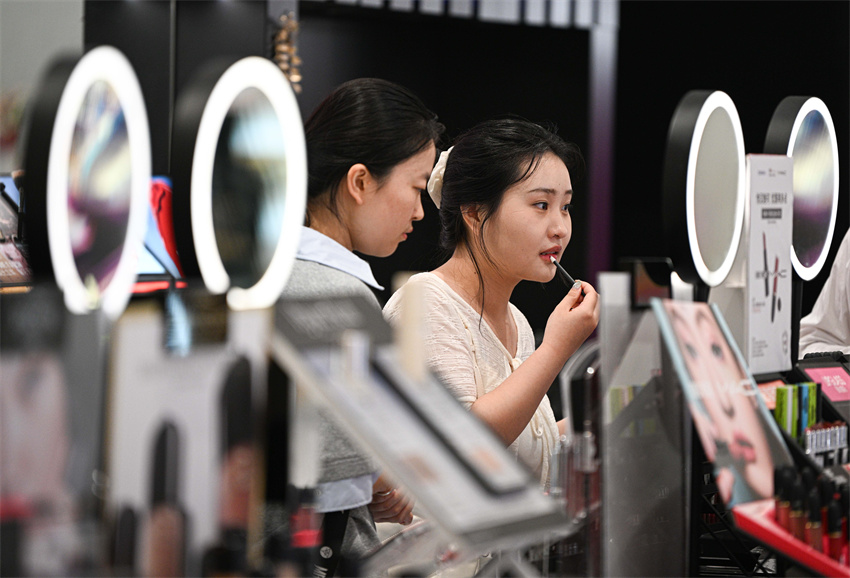 Una clienta prueba maquillaje en una tienda libre de impuestos en Haikou, provincia de Hainan, en el sur de China, el 25 de abril de 2026. (Xinhua/Pu Xiaoxu)