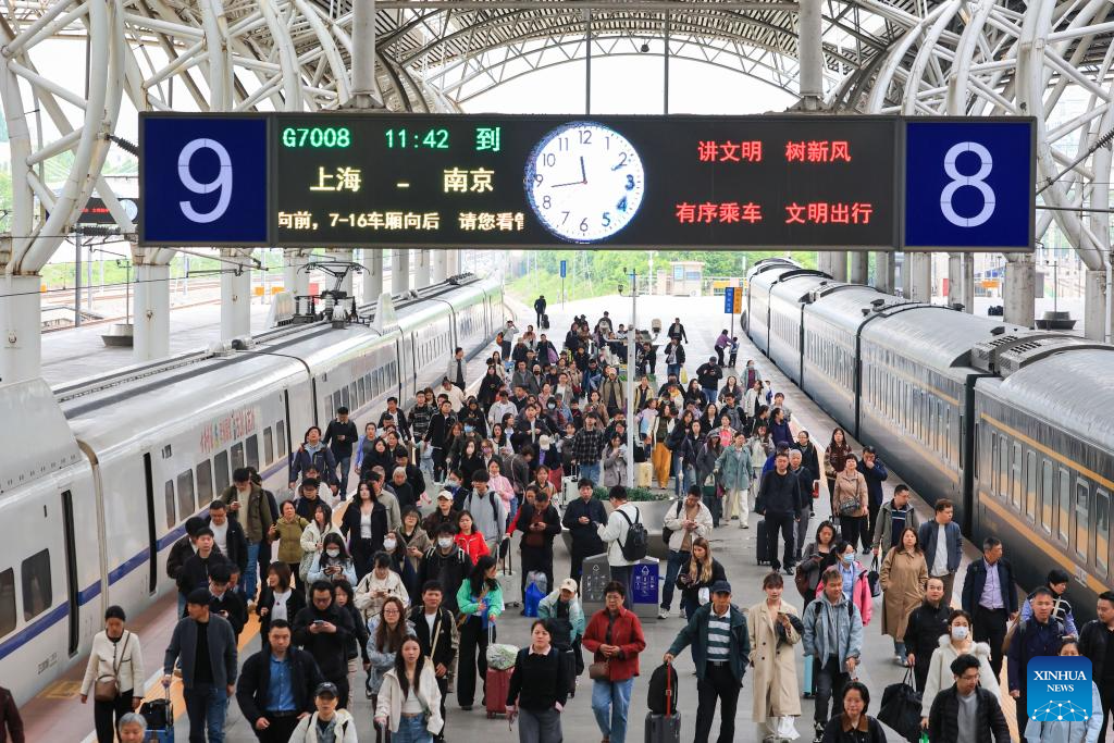 Pasajeros son vistos en la Estación del Ferrocarril de Nanjing, en Nanjing, en la provincia de Jiangsu, en el este de China, el 29 de abril de 2026. Se espera que los ferrocarriles de China gestionen 158 millones de viajes de pasajeros durante el período de viaje con motivo de las vacaciones del Primero de Mayo, una temporada de alta demanda de ocho días que va del 29 de abril al 6 de mayo, según informó el miércoles China State Railway Group Co., Ltd. Durante este período, se ha programado la circulación de un promedio diario de 12.000 trenes de pasajeros. (Xinhua/Su Yang)