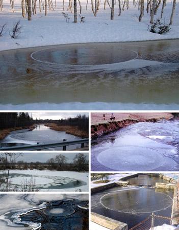 Cuando la gente descubre extrañas capas de hielo circulares en diversas áreas acuáticas del mundo, tiene la primera reacción de que serían probablemente obras maestras artificiales. Los científicos sostienen en general que tales capas de hielo, misteriosas, perfectas y de determinados diámetros, se forman rotando en las vorágines del agua. Como resultado, pedazos de hielo e impurezas flotantes se distribuyen de modo uniforme en el conjunto de hielo en movimiento voraginoso hasta que se forme gradualmente un círculo ideal básico. Hasta hoy el mayor círculo de hielo hallado tiene un diámetro superior a 500 pies. La gente ha encontrado círculos de hielo de distinto tamaño en diferentes lugares y fechas.