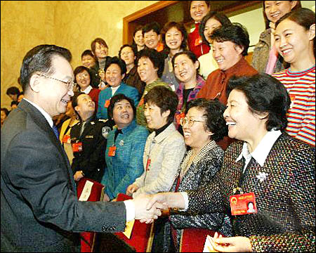 El día 7, el Primer Ministro Wen Jiabao se une a la delegación de diputados por la provincia de Jiangsu a la III Sesión de la X APN en el examen y deliberación del Informe sobre la labor del gobierno. Por motivo del Día de la Mujer del 8 de Marzo, Wen posa para fotografía junto con las diputadas de Jiangsu después de la reunión. (08/03/2005, CIIC)