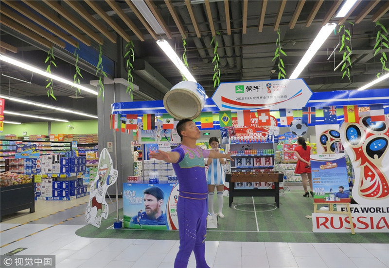 Lácteos Mengniu China lanza una promoción en un supermercado alusiva a la Copa Mundial 2018 el 3 de junio de 2018.