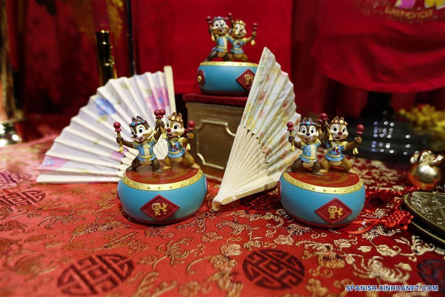 Imagen del 17 de enero de 2020 de tambores de estilo con los personajes de dibujos animados de Disney, Chip 'n' Dale, exhibidos durante las celebraciones del Año Nuevo Lunar chino en el Disney's California Adventure Park en Anaheim, Estados Unidos. Mickey y Minnie Mouse de Disney iniciaron el viernes la temporada de Año Nuevo chino en el Disney's California Adventure Park luciendo fabulosos con sus nuevos trajes tradicionales de estilo chino creados por el diseñador de moda internacional Guo Pei.