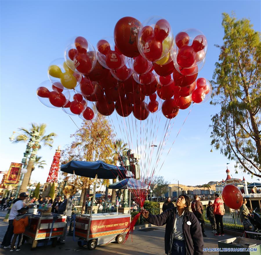 Imagen del 17 de enero de 2020 de una persona vendiendo globos rojos durante las celebraciones del Año Nuevo Lunar chino en el Disney's California Adventure Park en Anaheim, Estados Unidos. Mickey y Minnie Mouse de Disney iniciaron el viernes la temporada de Año Nuevo chino en el Disney's California Adventure Park luciendo fabulosos con sus nuevos trajes tradicionales de estilo chino creados por el diseñador de moda internacional Guo Pei.