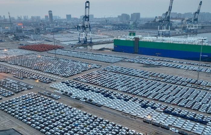 Vista aérea del 18 de enero de 2023 de vehículos esperando ser embarcados en el puerto de Yantai, en Yantai, en la provincia de Shandong, en el este de China.
