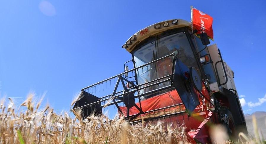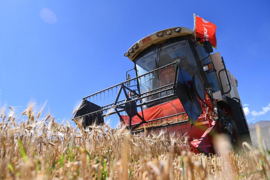 Una cosechadora opera en un campo de cebada de tierras altas en el poblado de Rasog del distrito de Gyangze, ciudad de Xigaze, en la región autónoma del Tíbet, en el suroeste de China, el 19 de septiembre de 2022.