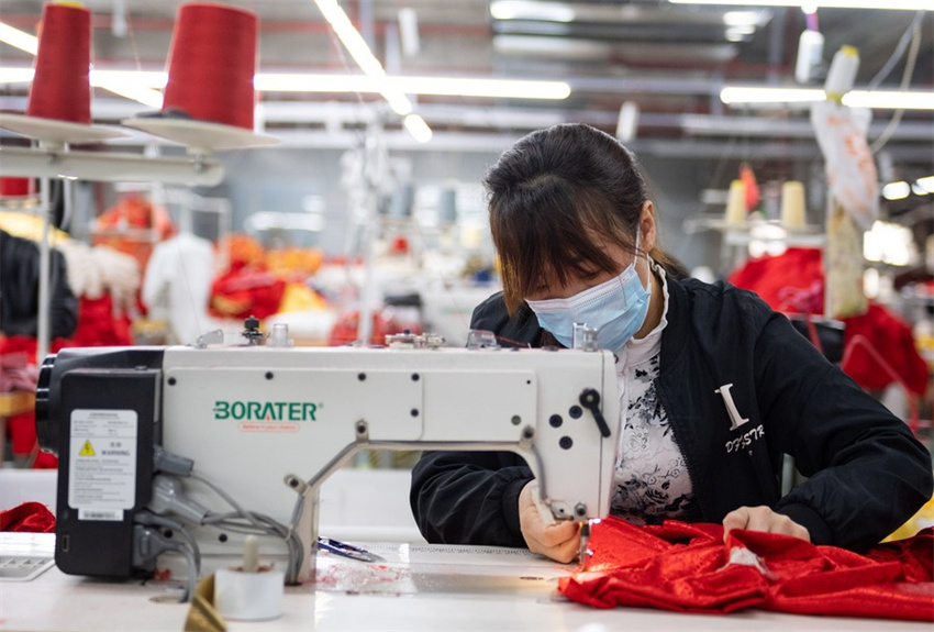 Una mujer trabaja en el taller de un nuevo asentamiento en el distrito de Zhenxiong, provincia suroccidental china de Yunnan, 13 de noviembre de 2020.