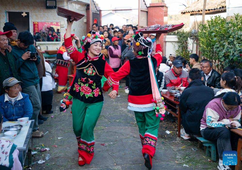 Lu Lihua (izquierda, delante) interpreta Yizu Tiaocai, una danza tradicional del grupo étnico yi, en una boda en la aldea Yongzheng de la ciudad de Baohua, distrito autónomo de la etnia yi de Nanjian, provincia suroccidental china de Yunnan, el 7 de febrero de 2025. (Xinhua/Chen Xinbo.)