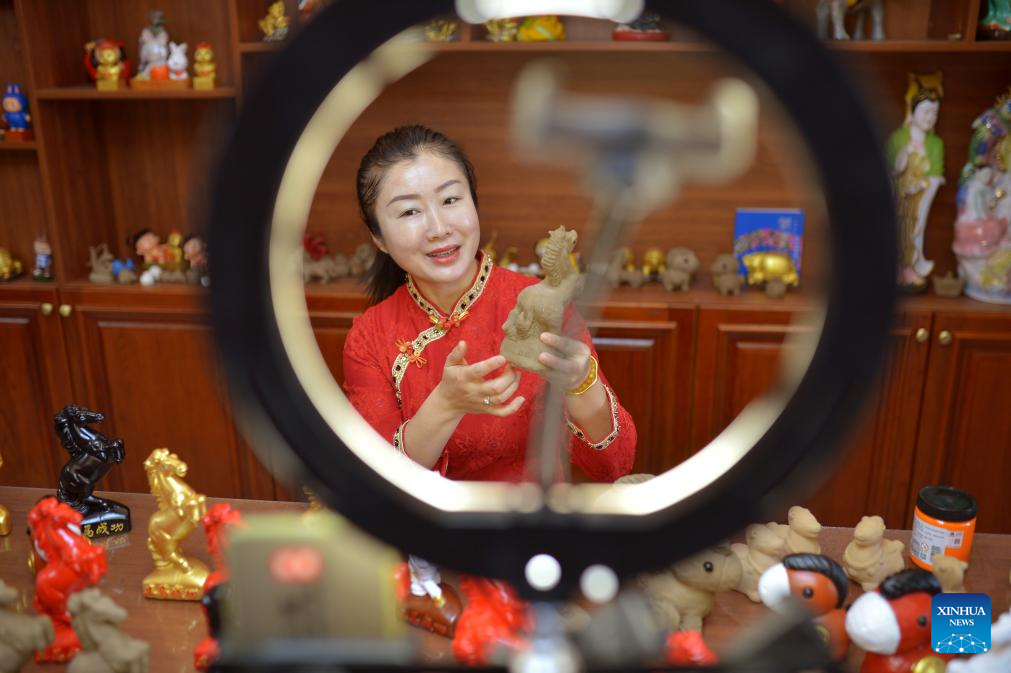 Una mujer promociona figuras de arcilla con temática ecuestre a través de una retransmisión en directo en un taller del distrito de Chengyang, en Qingdao, provincia de Shandong, este de China, el 21 de enero de 2026. (Foto de Wang Haibin/Xinhua).