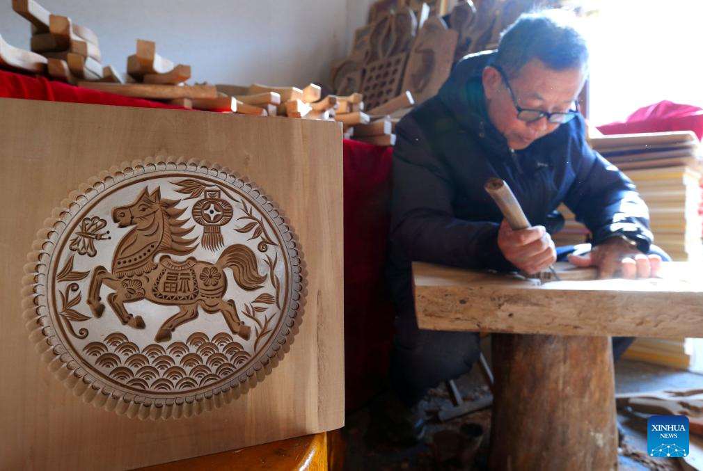 Un artesano realiza una artesanía en madera con motivos ecuestres en el distrito de Jimo, en Qingdao, provincia de Shandong, este de China, el 17 de enero de 2026. (Foto de Liang Xiaopeng/Xinhua).