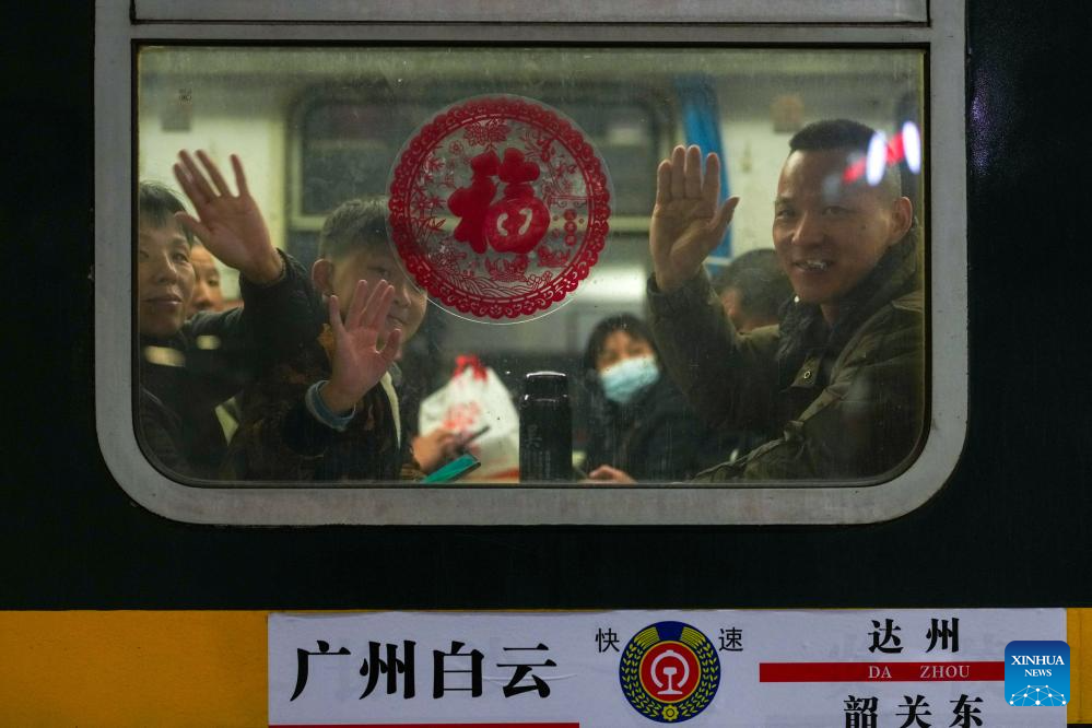 Los pasajeros se despiden a bordo de un tren en la estación de tren de Guangzhou Baiyun, en Guangzhou, provincia de Guangdong, sur de China, el 1 de febrero de 2026. (Xinhua/Wu Lu).