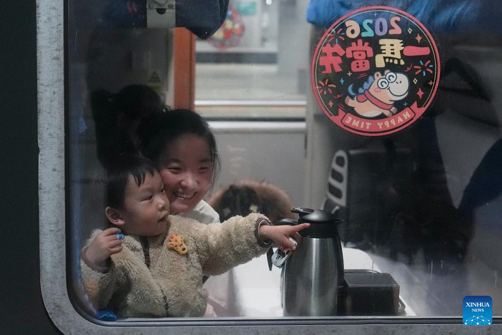 Una madre posa con su hijo de dos años en el tren n.º K4069 antes de viajar de regreso a su ciudad natal, Fuyang, para celebrar la Fiesta de la Primavera desde la estación de tren Beijing Oeste, en la capital de China, en la madrugada del 2 de febrero de 2026. (Xinhua/Ju Huanzong).